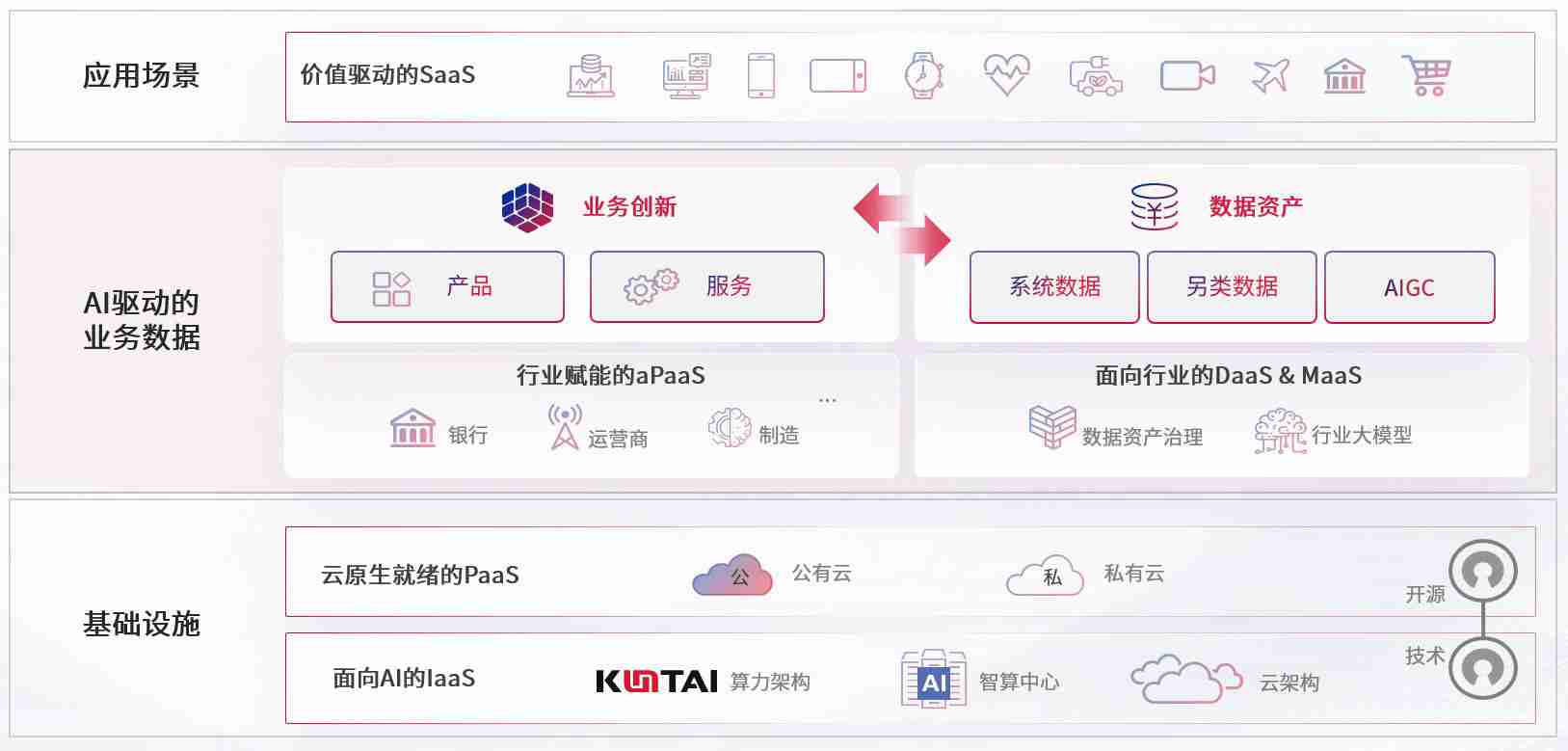 数字时代,,,围绕企业数字化转型的关键要素,,AG尊龙数码开创性的提出数云融合战略和技术体系框架,,,,着力在云原生、、、、数字原生、、AI原生和信创产业上架构产品和服务能力,,,,为处在不同数字化转型阶段的快消零售、、汽车、、、、金融、、、医疗、、政企、、、教育、、运营商等行业客户提供泛在的敏捷IT能力和融合的数据驱动能力,,构建跨界融合创新的数字业务场景和新业务模式,,助力企业级客户建立面向未来的核心能力和竞争优势,,,,全面推动社会的数字化、、智能化转型升级。。。